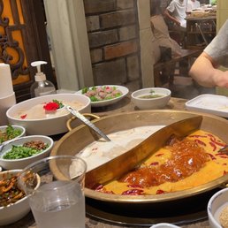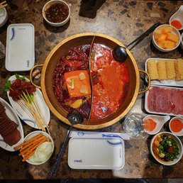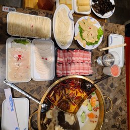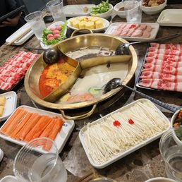 Authentic Chinese hotpot in the tangram mall. This place smells irresistible from outside and seeing people enjoy their hotpot from the windows sealed the deal and we had to try it. You order from a tablet and service is attentive. It is definitely pricier than the AYCE hotpot places that I'm used to in NJ and I can't say that I enjoyed myself more here, but it was worth it to try. They had tasty broth (though my boyfriend didn't really like his mala spicy broth, it was too oily/strong but I think that's just how Chinese hotpot broths are), a pretty good selection of meats and other toppings, a good sauce bar, as well as dessert/fruit bar.